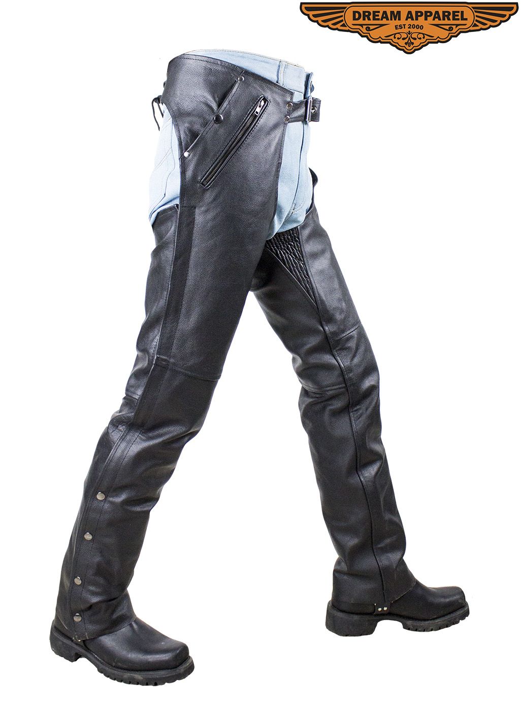 You cannot go wrong with a great pair of chaps and here at Dream Apparel, we provide the best. Introducing our beautiful new black multi-pocket naked cowhide leather chaps. These chaps include a total of four pockets, two of which are zippered and the other two are snapped. The pockets each supply a decent amount of added storage. Along with this, it features mesh lining. The leather is heavy duty top grade but also with a soft touch. There is a zipper that runs long the side of the pants until it reaches the snaps at the bottom that has a flap that hides the zipper. The chaps help you ride comfortably by providing the biker with grip while protecting from sweat and stirrup leather.