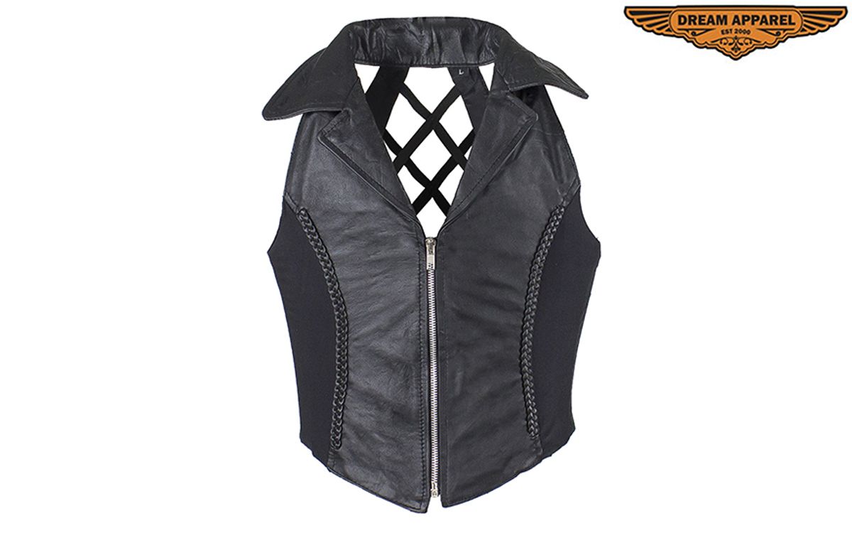 Great women’s halter-top made from genuine leather features a classic styled collar, stylish braid design, and a front zipper.