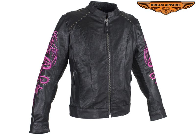 If you believe in carrying personal protection and the freedom that riding brings, then Dream Apparel's genuine naked cowhide leather jacket featuring two large interior gun pockets with elastic straps and button snaps is for you. Two zippered waist pockets allow you to carry plenty of other items you may want to bring along and the beautiful hot pink embroidered and studded design on the shoulders and sleeves makes a striking finish to this amazing leather jacket. The full zip-out, quilted lining, zippered cuffs with snaps, and a zippered front closure mean your comfort's guaranteed regardless of the weather and make these wonderful ladies jackets very popular. Be sure to get your order in right away as these jacket sell quickly.